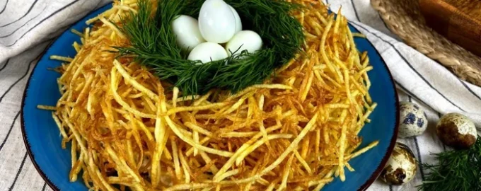 Originální salát „Tetřeví hnízdo“ nebo „Křepelčí hnízdo“ je ideální variantou toho, co připravit na svátek. Recept je nekomplikovaný a dostupný pro každého. A výsledek je tak chutný, že nikdo neodmítne přídavek.
